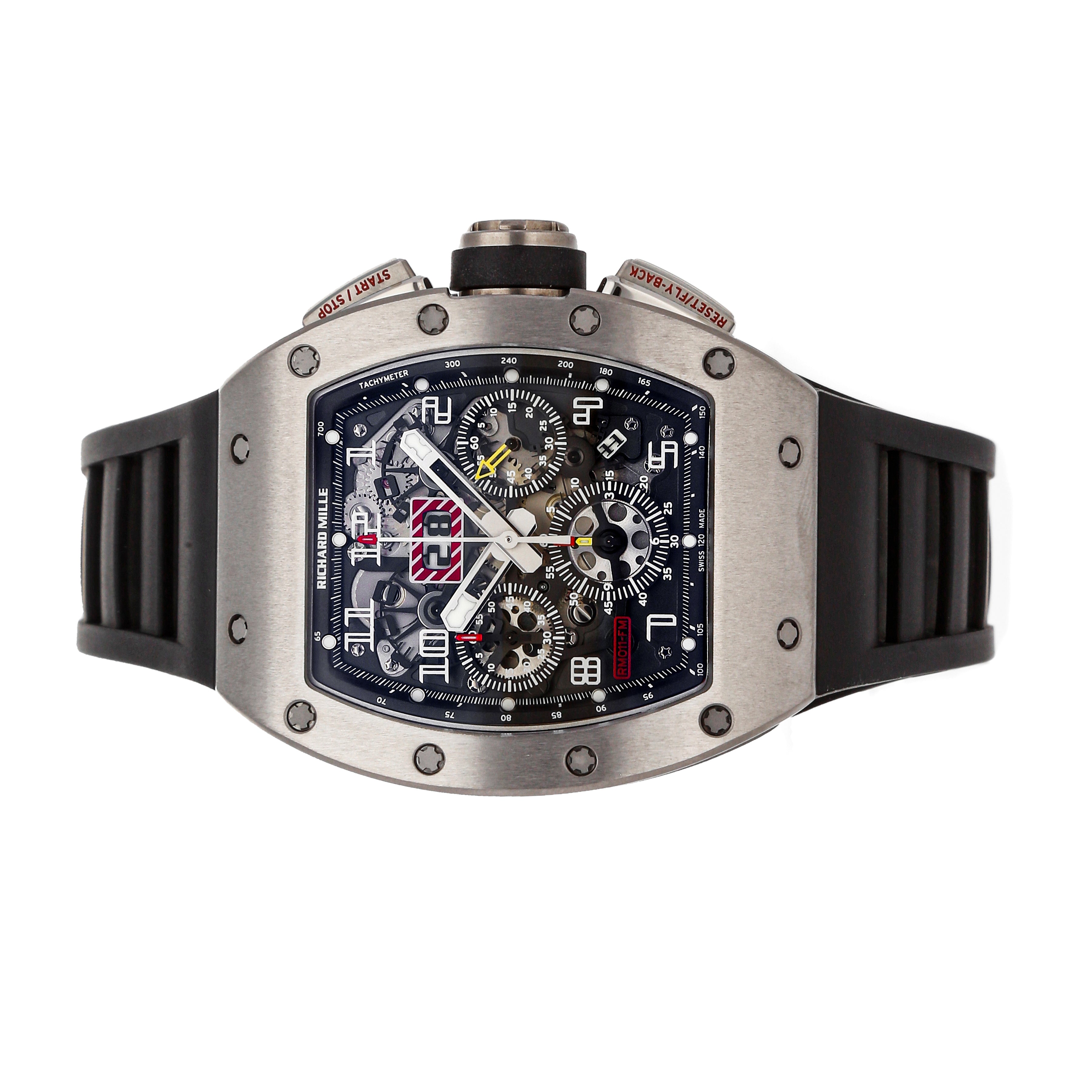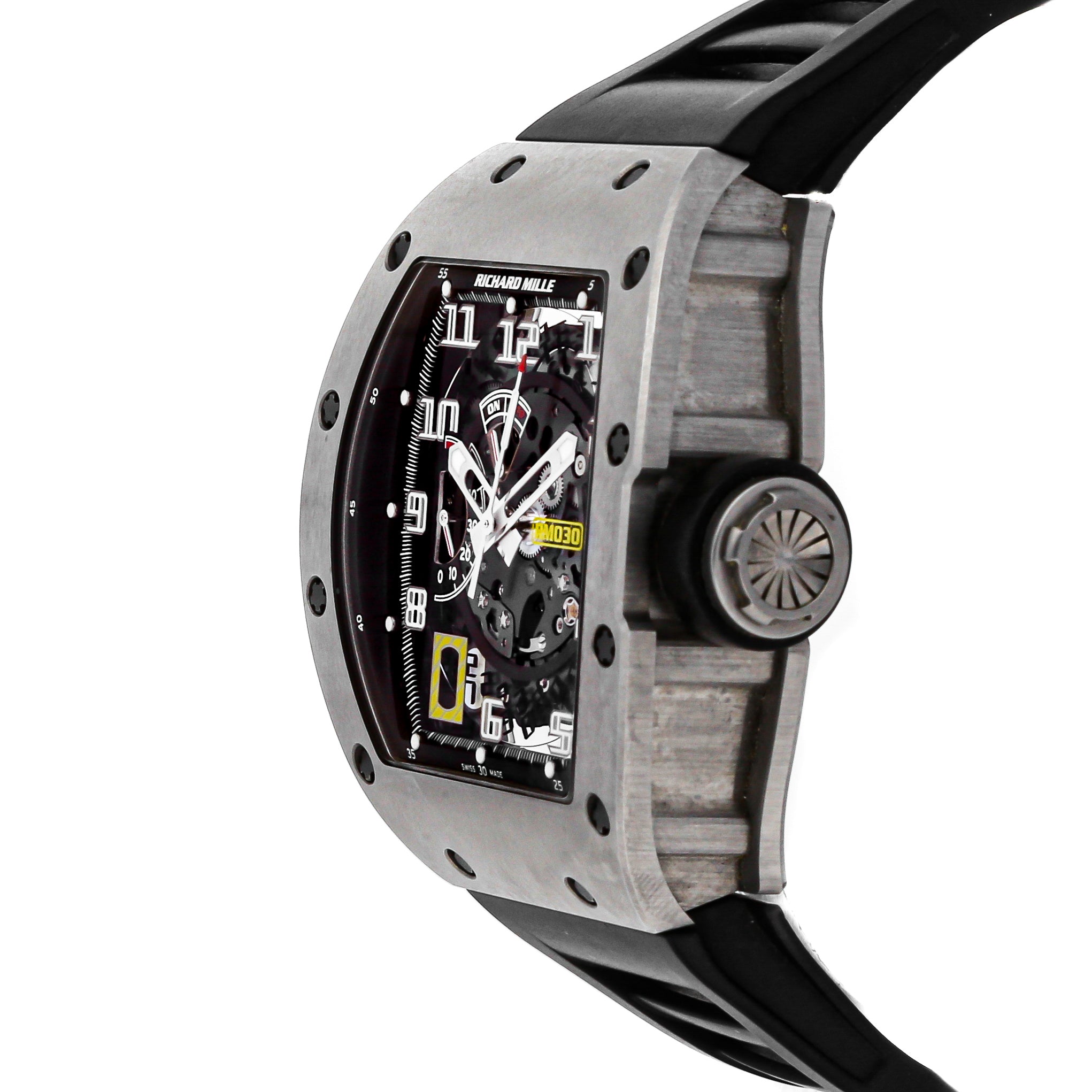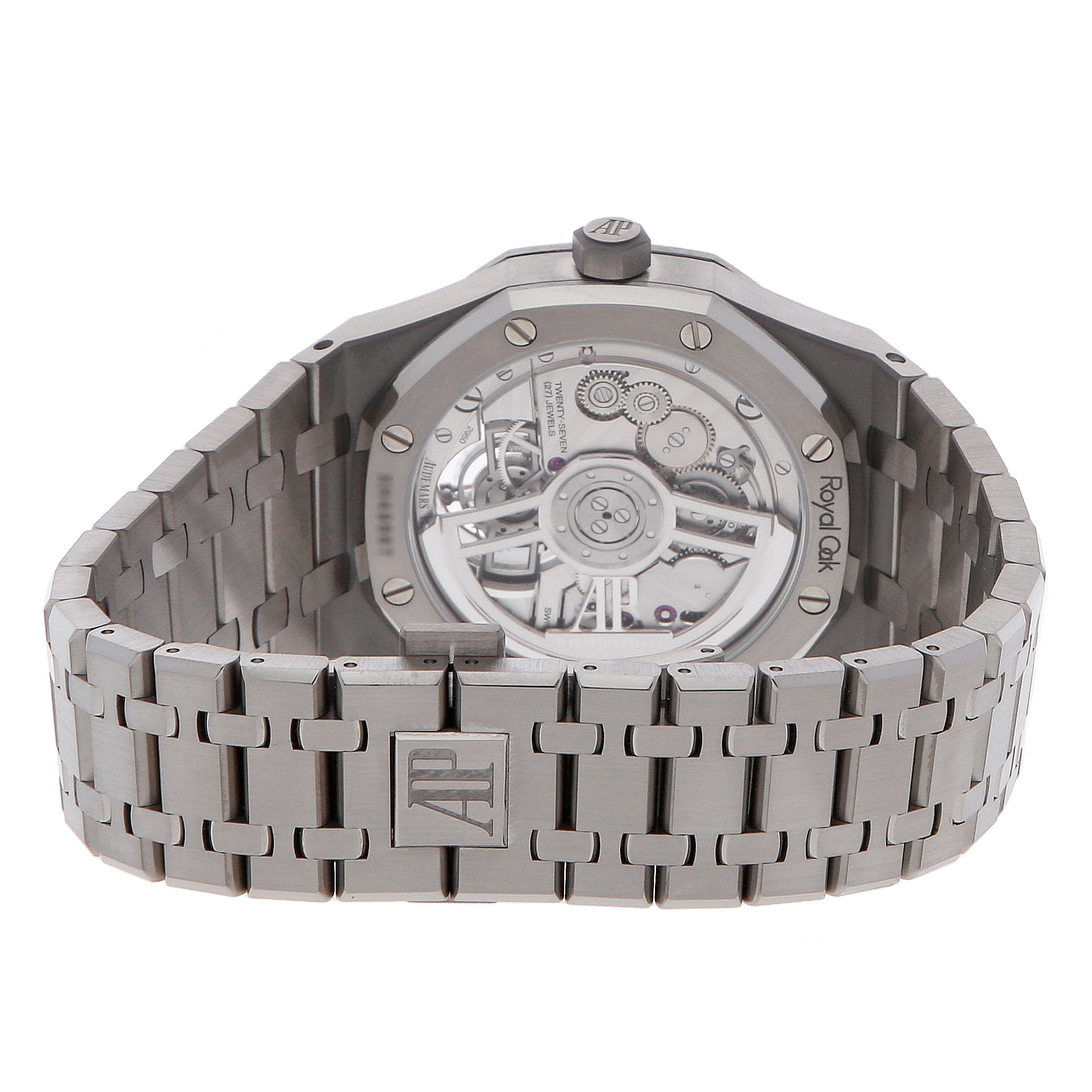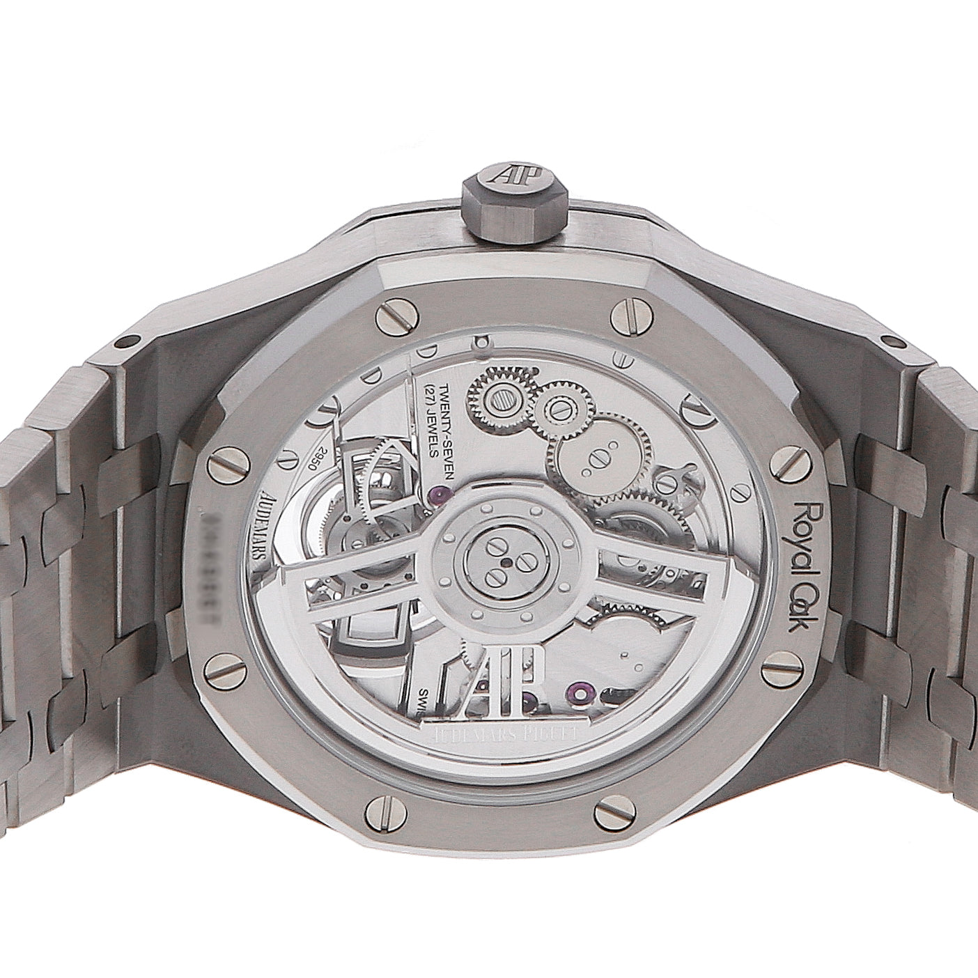 The Audemars Piguet Royal Oak Tourbillon Titan 26530TI is an exquisite luxury watch made of titanium, characterized by its striking octagonal case design and integrated bracelet links. The case has a diameter of 41 mm and is particularly elegant thanks to a sophisticated mix of satin-finished and polished surfaces. The skeletonized dial offers a view of the precise hand-wound movement, which includes the highly complex tourbillon that ensures maximum accuracy. The luminous white gold indices and hands ensure optimum legibility. A sapphire crystal display back allows the artistically decorated movement to be viewed. The Royal Oak Tourbillon Titan 26530TI combines technological innovation with masterful craftsmanship and elegance.